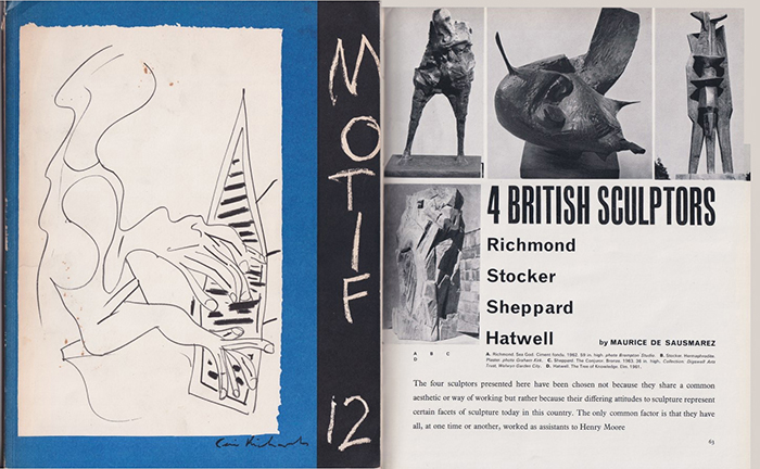 MOTIF 12: WINTER 1964 Contributed by Abigail Sheppard, 2024 Four British Sculptors: Richmond Stocker Sheppard Hatwell by MAURICE DE SAUSMAREZ p 63 The four sculptors presented here have been chosen not because they share a common aesthetic or way of working but rather because their differing attitudes to sculpture represent certain facets of sculpture today ni this country. The only common factor is that they have all, at one time or another, worked as assistants to Henry Moore |