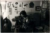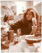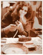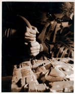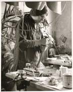 Dramatische Effekte hat nicht nur die Keramikarbeit, dramatisch ist auch das Zuschauen bei der Goldschmiedearbeit meiner Mutter. Das Hantieren mit der offenen Gasflamme, einmal weich eingesetzt, um die Metallteile anzuwärmen, dann durch Blasen in das Luftröhrchen blau, spitz und hart, bis das Stück rot und dann weiß glüht, und zu einem Kügelchen schmilzt, um dann zerhämmert zu werden, schmelzendes Lot, brodelnde Boraxpfützen und tanzende Wassertröpfchen auf dem noch heißen, nicht mehr glühenden Stück zur Abkühlung, oder mit einem Zisch ins Wasser geworfen. Zangen, Sägen, feine Bohrer, Feilen, Polierrot, Punzen, Hämmerchen. Eine etwas wuchtigere Form der Metallbearbeitung ergab sich aus der Notwendigkeit, Bronzereliefs, wenn sie von Gießer kamen, auszuarbeiten. |