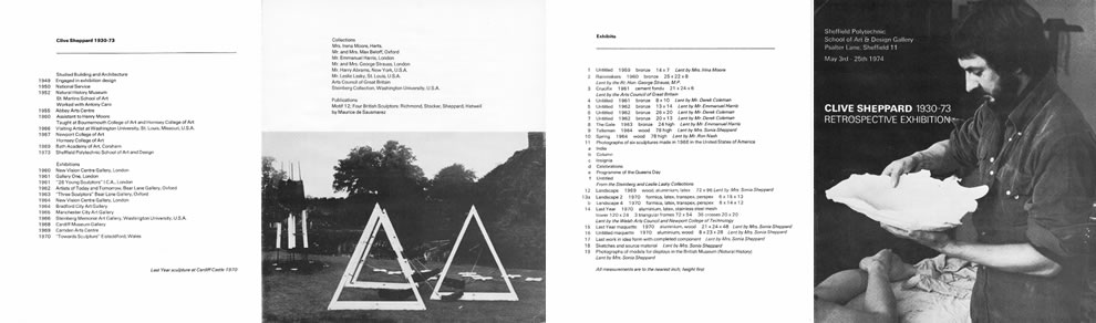 Above: Original Exhibition Catalogue Sheffield Polytechnic School of Art & Design Gallery (Retrospective), 1974 Contributed by Daniel Anthony, 2015 Oben: Ausstellungskatalog Sheffield Polytechnic School of Art & Design Gallery, (Retrospective), 1974 Biography and an art and research project description by Clive Sheppard from this catalogue titleS: 1 Untitled 1959 bronze 14 x 7 Lent by Mrs. lrina Moore 2 Rainmakers 1960 bronze 25 x 22 x 8 Lent by the Rt. Hon. George Strauss, M.P. 3 Crucifix 1961 cementfondu 21 x 24 x 6 Lent by the Arts Council of Great Britain 4 Untitled 1961 bronze 8 x 1O Lent by Mr. Derek Coleman 5 Untitled 1962 bronze 13 x 14 Lent by Mr. Emmanuel Harris 6 Untitled 1962 bronze 26 x 2O Lent by Mr. Derek Coleman 7 Untitled 1962 bronze 20 x 13 Lent by Mr. Derek Coleman 8 The Gate 1963 bronze 24 high Lent by Mr. Emmanuel Harris 9 Talisman 1964 wood 78 high Lent by Mrs. Sonia Anthony 1O Spring 1964 wood 78 high Lent by Mr. Ron Nash 11 Photographs of six sculptures made in 1966 in the United States of America a lndia b Column c lnsignia d Celebrations e Programme of the Oueens Day f Untitled From the Steinberg and Leslie Lasky Collections 12 Landscape 1969 wood, aluminium, latex 12 x 96 Lent by Mrs. Sonia Anthony 13a Landscape 2 1970 formica, latex, transpex, perspex 6 x 15 x 13 13b Landscape 4 1 970 formica, latex, transpex. perspex 6 x 14 x 12 14 Last Year 197O aluminium, latex, stainless steel mesh tower 120 x 24 3 triangular f rames 72 x 54 36 crosses 20 x 20 Lent by the Welsh Arts Council and Newport College of Technology 15 Last Year maquette 1970 aluminium, wood 21 x 24 x 48 Lent by Mrs. Sonia Anthony 16 Untitled maquette 1970 aluminium, wood 8 x 23 x28 Lent by Mrs. Sonia Anthony 17 Last work in idea form with completed component Lent by Mrs. Sonia Anthony 18 Sketches and source material Lent by Mrs. Sonia Anthony 19 Photographs of models for displays in the British Museum (Natural History) Lent by Mrs. Sonia Anthony |