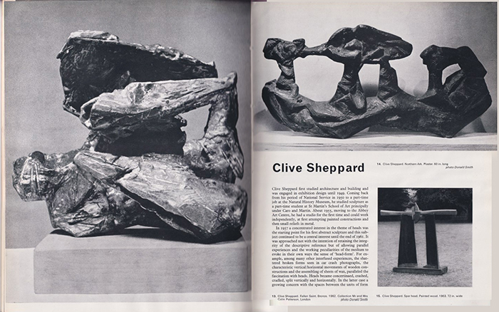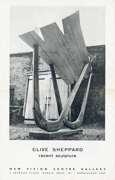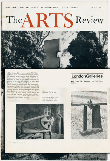 Text from the Arts Reviews Magazine, July 25–August 8 1964 Clive Sheppard is a young sculptor of the 'Charing Cross' school whose forms in polished, stained and textured wood describe new dimensions of allegory and association. These large, architectonic structures, by virtue of their organic, worn surface qualities as well as their subtlety of space and shape, have a boldness and largeness of vision without appearing dehumanised and mechanistic. Sheppard's sculpture has the mellowness of old furniture, and much of its structural honesty and rightness, allied to qualities of symbolic and legendary allusion, not too obvious archetypes and creative myths. Its ideal setting would perhaps be large glass and concrete interiors, whose cold geometry would be an excellent foil for these very characterful forms instinct with life. ALAN STEVENSON Right CLIVE SHEPPARD Below left The Artist at work |