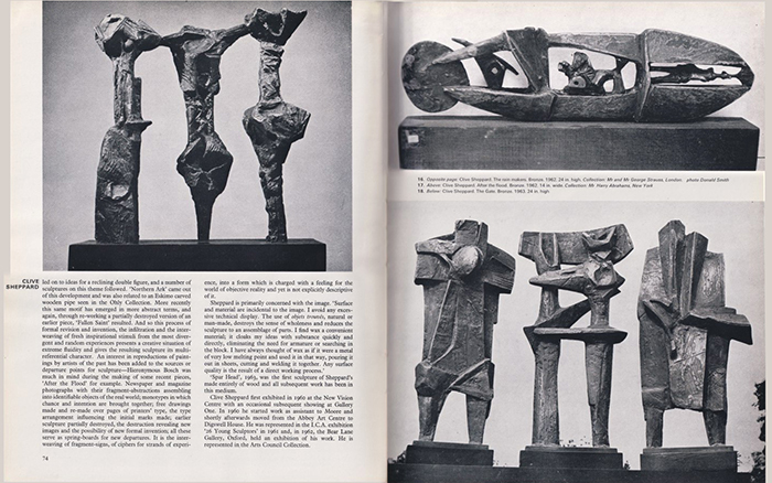 MOTIF 12: WINTER 1964 Contributed by Abigail Sheppard, 2024 Four British Sculptors: Richmond Stocker Sheppard Hatwell by MAURICE DE SAUSMAREZ p 63 The four sculptors presented here have been chosen not because they share a common aesthetic or way of working but rather because their differing attitudes to sculpture represent certain facets of sculpture today ni this country. The only common factor is that they have all, at one time or another, worked as assistants to Henry Moore |